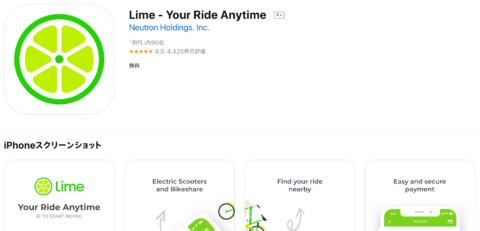 普段からiPhoneを使っているので、iPhoneでの使い方を簡単に説明すると、まずLimeのスマートフォンアプリをダウンロードします。日本で「LIME ライム」と検索すると、美容師のカルテ管理や予約管理するアプリが出てくるかもしれませんが、それではなくLime – Your Ride Anytimeの方です。アイコンがもっとライムの切り口みたいなやつです。